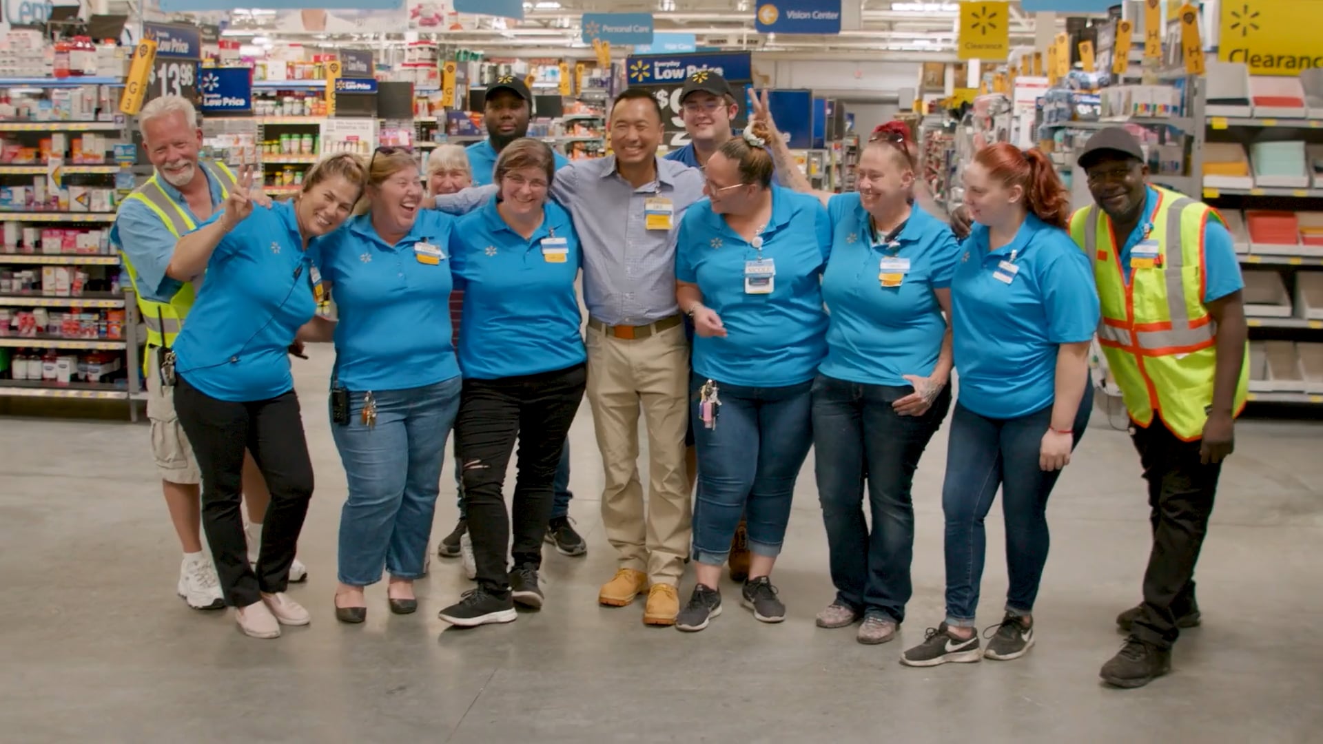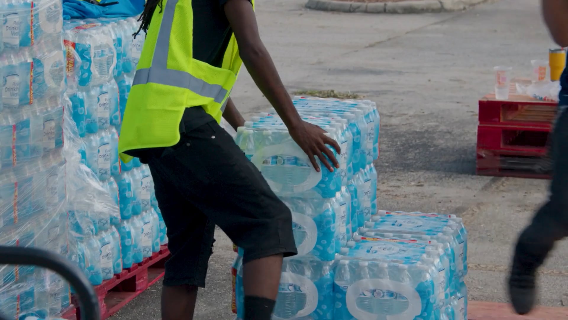 Walmart associates are see loading cases of water bottles from pallets into trunks of vehicles. A Heartland Food Bank is seen in the background.