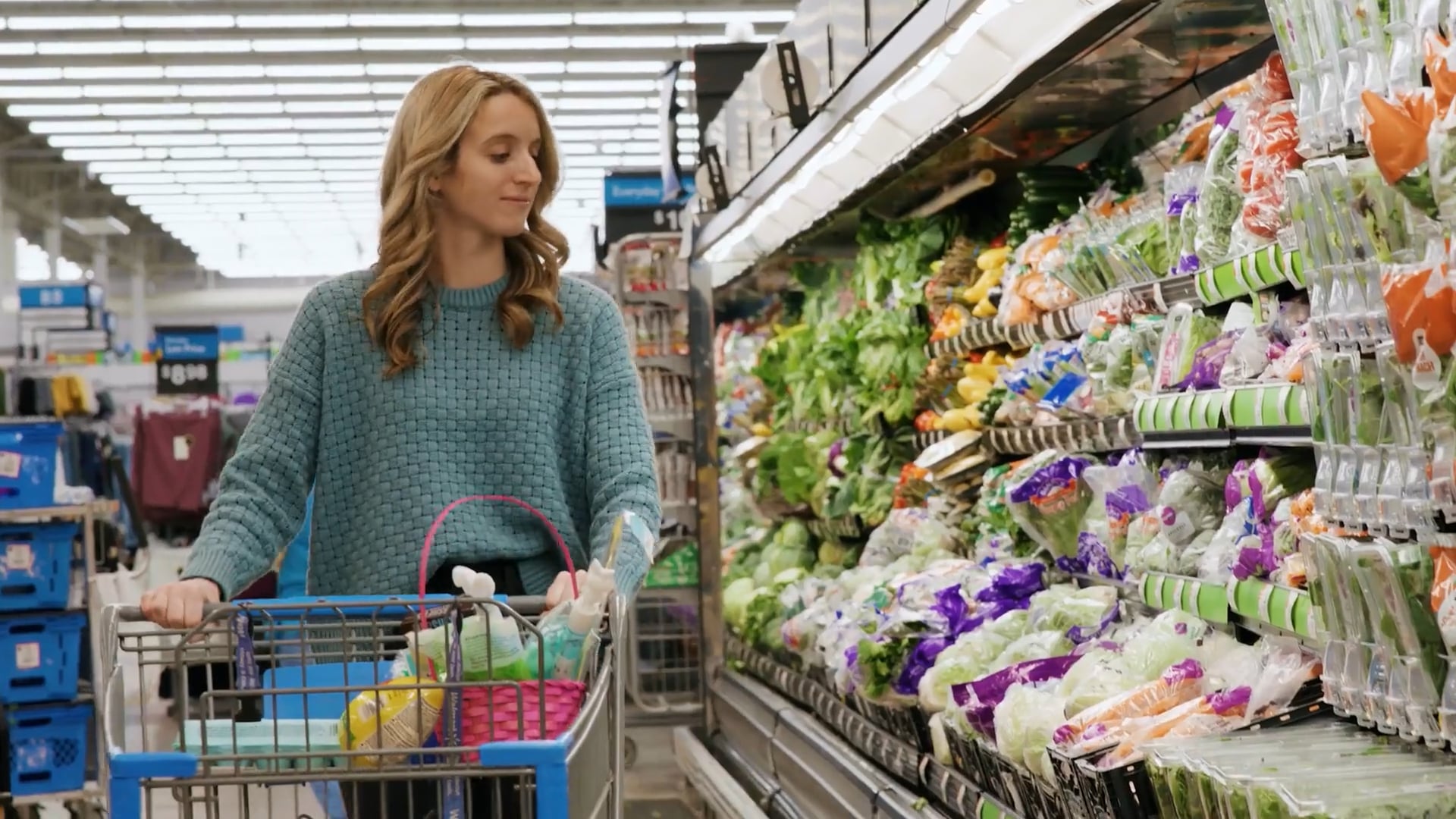 An image of a female shopper in a blue sweater pushes a grocery cart past the refrigerated vegetables at Walmart.